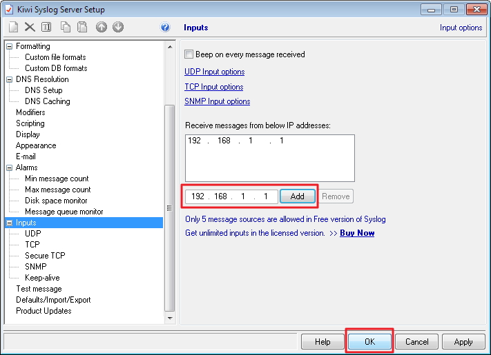 1.7. Next, go to the Inputs menu and add the IP address of the router in your home network here (in our example, the router has the IP address 192.168.1.1). Click OK to save the settings.