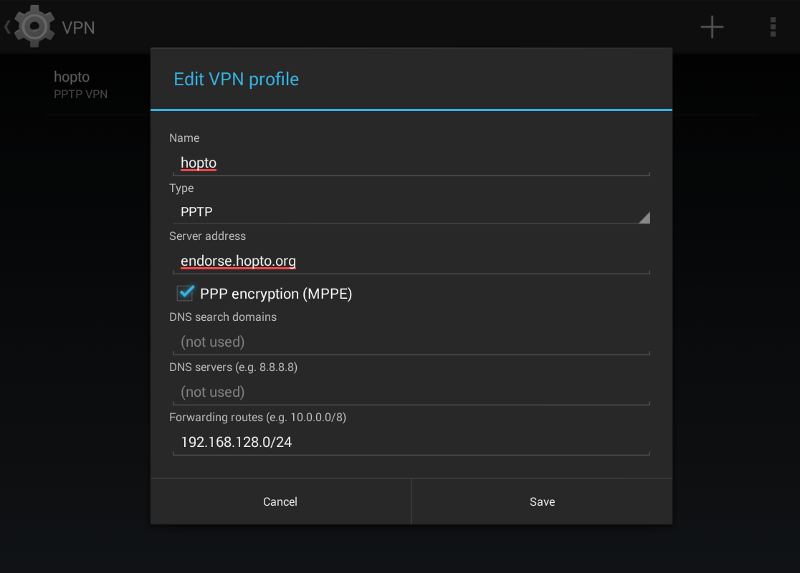 Внимание! Указанная в поле Forwarding routes подсеть Домашнего интерфейса отключает также и маршрутизацию всего трафика Android через PPTP-туннель.