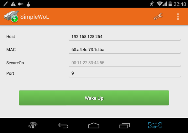 Сначала установим на мобильное устройство под управлением ОС Android программу для отправки специального Magiс-пакета SimpleWoL, простой интерфейс которой позволяет указать широковещательный адрес в сети, MAC-адрес компьютера, который требуется включить, опциональный ключ SecureOn (для сетевых адаптеров, которые поддерживают данную функцию) и порт для передачи пакета (в нашем примере его номер не играет роли).