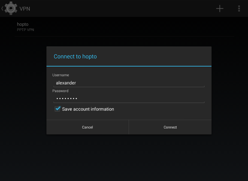 Далее, выполним подключение к PPTP-серверу роутера Keenetic с заранее настроенными именем пользователя и паролем. Для получения дополнительной информации обратитесь к статье «Реализация сервера PPTP».
