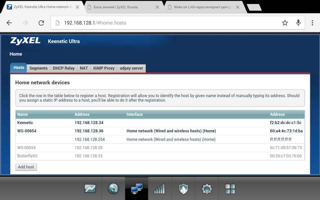 После подключения, откроем веб-конфигуратор Keenetic в браузере по его адресу в домашней сети. В разделе Системный монитор - Система на схеме портов коммутатора должно быть видно подключение кабеля Ethernet от сетевой карты компьютера, а в разделе Домашняя сеть - Устройства должен отображаться IP-адрес, используемый для широковещательной рассылки (в нашем примере это 192.168.128.254).