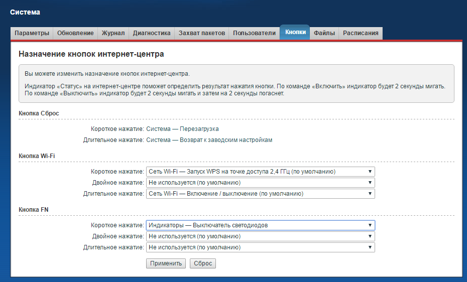 При першому спрацьовуванні кнопки вимикаються світлодіоди на лицьовій панелі, при другому - індикатори на задній панелі, при третьому - всі індикатори, при четвертому - відновлюються заводські налаштування, тобто стан, коли горять всі індикатори.