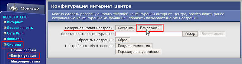 1. Для збереження налаштувань (файлу конфігурації) зайдіть в меню Система> Конфігурація і в полі Резервна копія налаштувань натисніть кнопку Без паролів.