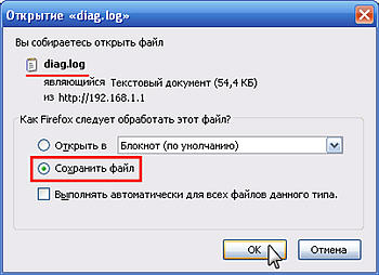 З'явиться вікно для збереження файлу. У цьому вікні вказано ім'я файлу (в нашому прикладі це файл diag.log). Вкажіть Зберегти файл, натисніть кнопку OK і потім вкажіть теку, в яку буде збережений файл діагностики.