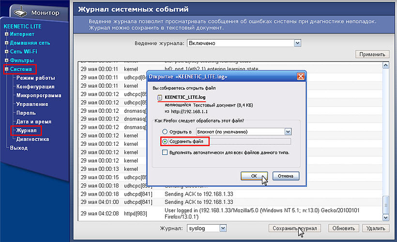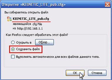 Потім з'явиться вікно для збереження файлу конфігурації. У цьому вікні вказано ім'я файлу (в нашому прикладі це файл KEENETIC_LITE_pub.cfg). Вкажіть Зберегти файл, на