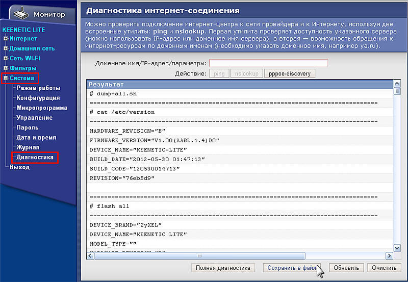 3. Для збереження файлу діагностики зайдіть в меню Система> Діагностика. Спочатку натисніть кнопку Повна діагностика і після отримання результатів натисніть кнопку Зберегти в файл для збереження результатів діагностики у файлі на комп'ютері.