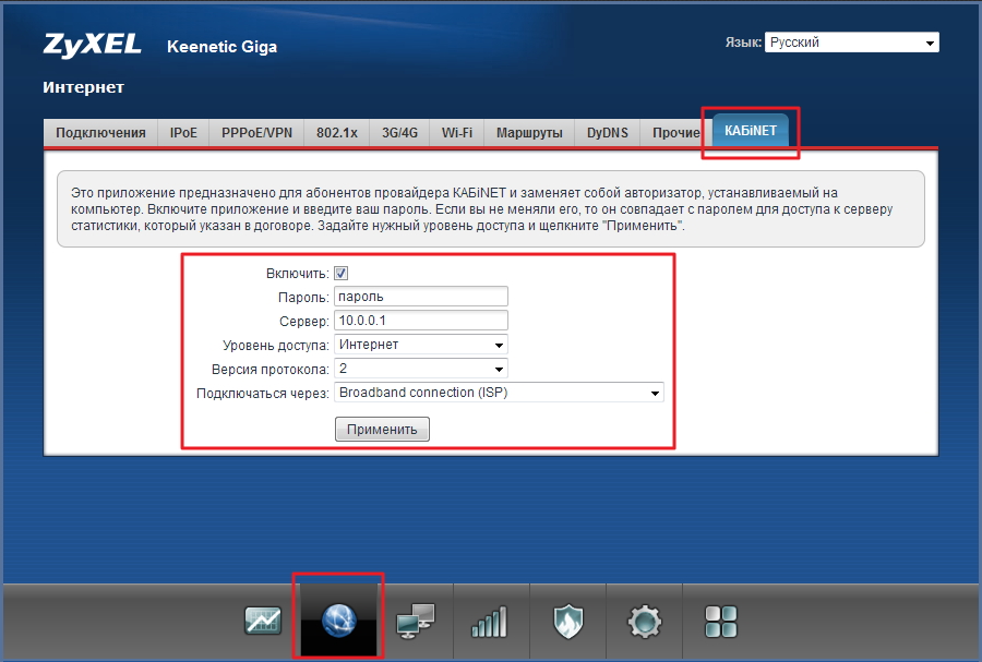 2. Увімкніть авторизацію КАБiNET в інтернет-центрі Keenetic. Підключіться до веб-конфігуратору пристрою, зайдіть в меню Інтернет> КАБiNET, встановіть галочку в полі Увімкнути, в полі Пароль вкажіть пароль, наданий провайдером, в полі Сервер вкажіть IP-адресу сервера. Налаштування в полях Рівень доступу і Версія протоколу залиште незмінними. В полі Підключатися через можна вказати інтерфейс, через який буде здійснюватися авторизація до мережі провайдера КАБiNET. Натисніть кнопку Застосувати для збереження параметрів.