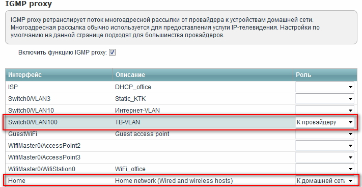 Після створення інтерфейсів необхідно увімкнути IGMP Proxy в меню Домашня мережа> IGMP Proxу та вказати ролі для інтерфейсів: створене підключення з VLAN 100 - До провайдера, Home network - До домашньої мережі.