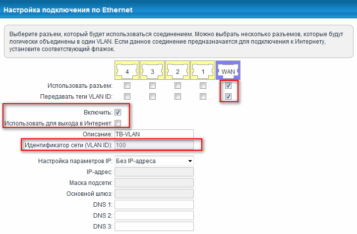 У нашому прикладі у провайдера в VLAN 100 не використовується DHCP-сервер, тому в полі Налаштування параметрів IP вказуємо значення Без IP-адреси.