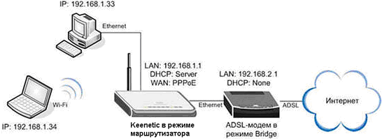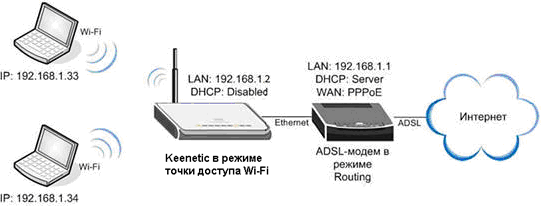 В режимі маршрутизатора ADSL-модем сам буде повністю встановлювати ADSL-підключення з провайдером (буде автоматично здійснювати PPPoE-авторизацію), а інтернет-центр Keenetic потрібно підключити за допомогою Ethernet-кабелю до ADSL-модему і налаштувати режим звичайної бездротової точки доступу. В цьому режимі Keentic буде працювати в якості бездротового мосту між комутатором і точкою доступу, тобто всі Ethernet-порти вбудованого комутатора і бездротової точки доступу стають прозорими. При цьому IP-адреси комп'ютерів домашньої мережі (що підключені по Wi-Fi і по Ethernet) автоматично буде роздавати ADSL-модем (трансляція IP-адрес і маршрутизація також буде здійснюватися ADSL-модемом).