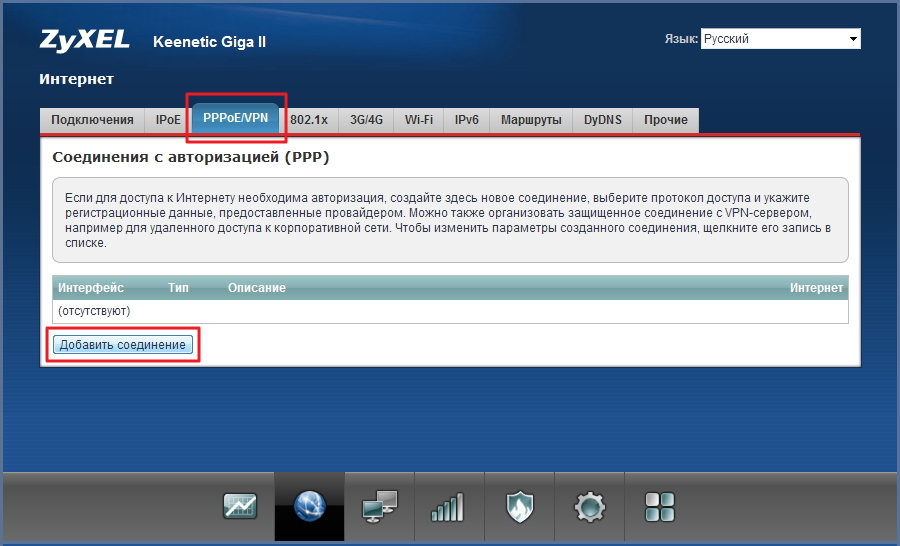 Налаштування інтернет-центру Keeentic слід проводити через вбудований веб-конфігуратор. Зайдіть в меню Інтернет> PPPoE / VPN і натисніть кнопку Додати з'єднання для налаштування параметрів підключення до Інтернету.