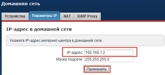 Для налаштування інтернет-центру серії Keenetic підключіться до його веб-конфігуратору. Рекомендуємо спочатку змінити IP-адресу інтернет-центру (за замовчуванням встановлено 192.168.1.1), щоб він не конфліктував з IP-адресою модему і призначити йому IP-адресу з підмережі ADSL-модему (в нашому прикладі з підмережі 192.168.1.x) . Це можна зробити в меню Домашня мережа> Параметри IP. Увага! При зміні IP-адреси інтернет-центру і натисканні на кнопку Застосувати Ви втратите підключення до його веб-конфігуратору. Для відновлення доступу до веб-конфігуратору в адресному рядку веб-браузера наберіть нову IP-адресу пристрою (в нашому прикладі це 192.168.1.2).